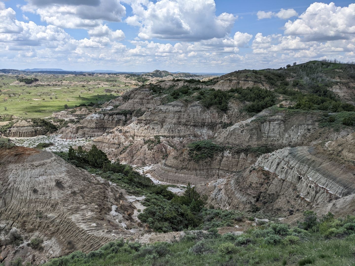 We ended up in the top Eastern portion of North Dakota. We needed to get to the bottom Western portion, so we could traverse the Teddy Roosevelt National Park from South to North. But it was raining a lot. So we started at the south end of the North Unit of the park. The next day we visited the much busier South Unit. While the South Unit is more picturesque and badlandy, the North Unit has more altitude changes and views and cool stuff. Oh, maybe not. But it is much less busy.