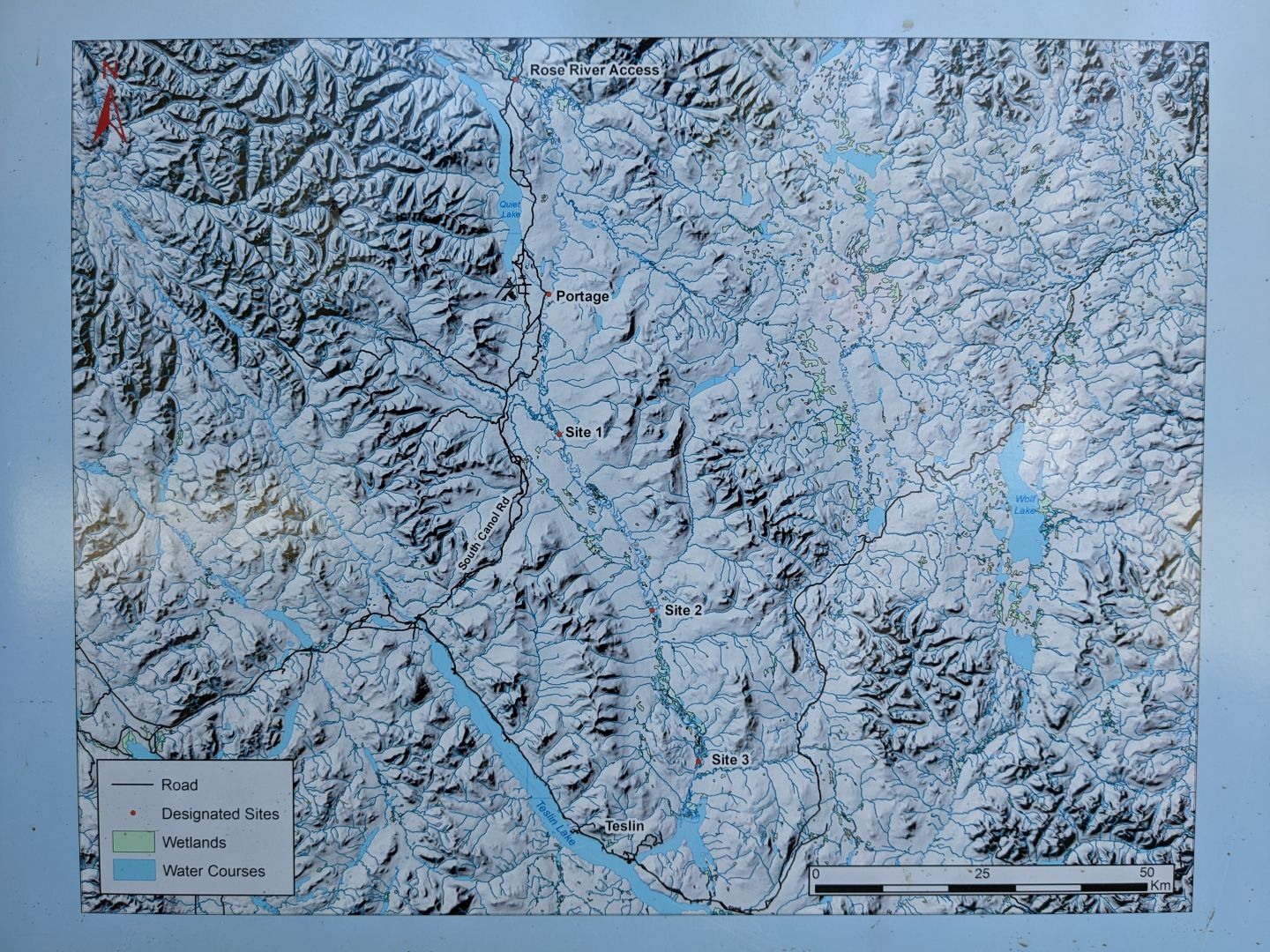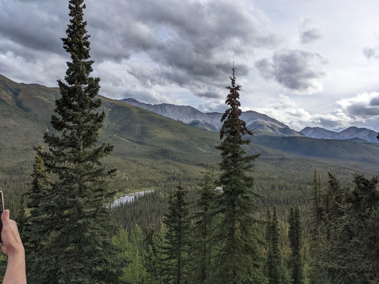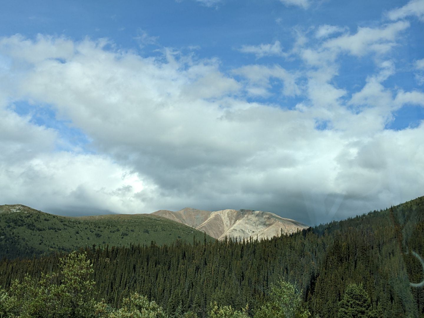 Then on to the Canol Road, which is in two parts: a Southern end and a Northern one. The Southern end was an easy drive and moderately pretty. It got better the farther North we went. Bumped into some travelers from Arkansas who gave us good advice. And then we got to the North half. We filled up gas at Ross River, which was strangely complicated with a sheet of directions. On the first try I didn’t get it right. The road up is 150 miles, and then another 150 miles back. That totals 300, which is just about the limit of my camper. So I filled up the 2 spare gas cans on top of the cab for another 100 miles of breathing space, and rolling space. And then, we drove onto the ferry to get across the Pelly River. After that, we only saw another 4 cars over the next 4 days.