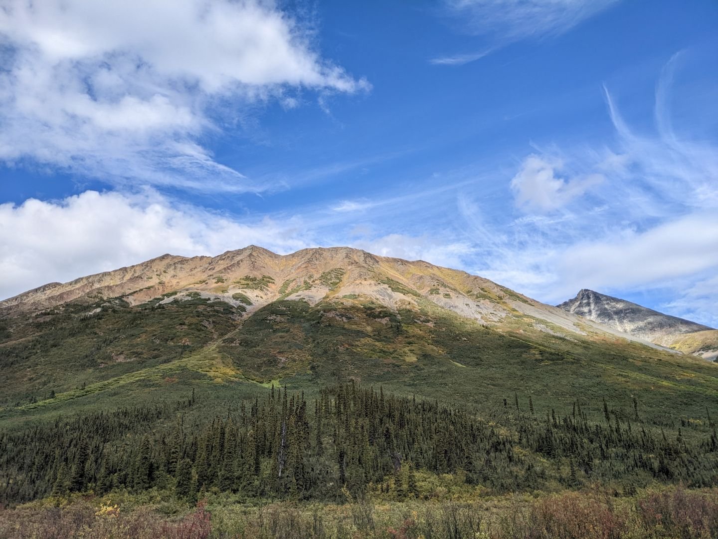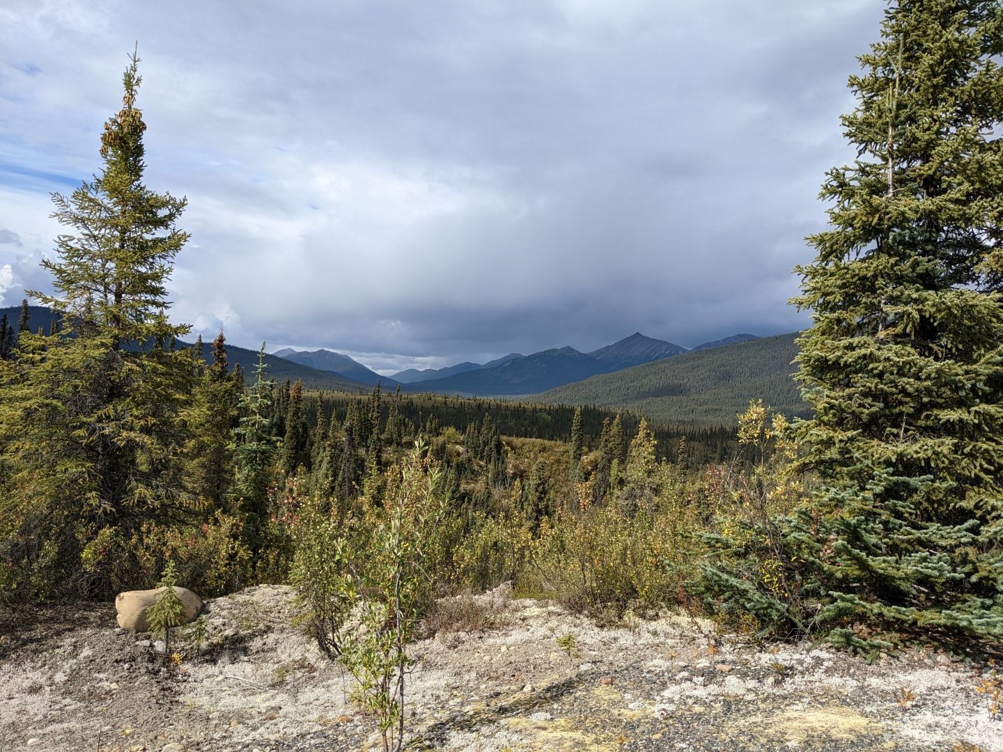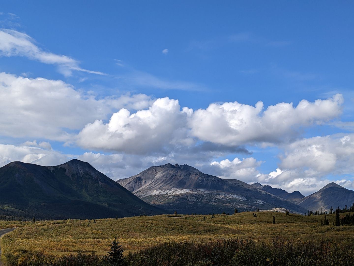 The road was horrible, terrible, the worst evar. Really. It’s the worst road that I never turned around on and gave up on. Mostly I never got over 25 MPH. Mostly I never got out of first gear. And it was much more dramatically beautiful than the southern half. The first night was at Dragon Lake, which is the most beautiful camping spot I’ve ever been to. It’s a 3 or 4-way tie for most beautiful camping spot, but Dragon Lake definitely makes the cut. The next day, there were distant glaciers and vehicles parked since WWII. And once our gas was halfway gone it was clear we were not near the end of the road. Apparently, 1st gear doesn’t get the mileage that 4th gear gets. I asked Mary if we should turn around, and amazingly she said, “Let’s keep going. If we have to walk for gas at the end, that’ll be part of the adventure.” She did make me stop reading out our remaining mileage every 5 minutes though. So we get to the top, and there’s the border with the Northwest Territories, and a couple with what I would think is a Scottish accent, but which may just be your ordinary backwoods Canada accent, said the road wasn’t worth continuing on. So we drove back to a pullout and slept for the night.